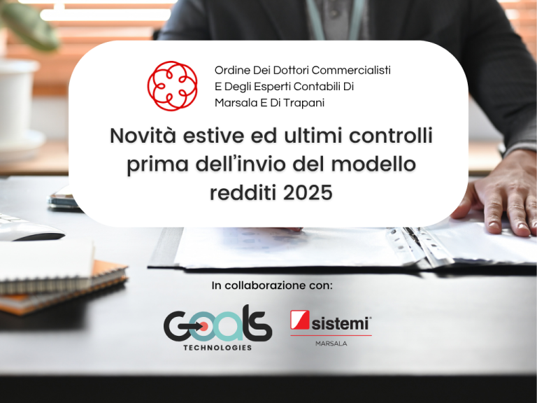Goals Technologies S.r.l., Partner Sistemi Marsala, in collaborazione con l’Ordine dei Dottori Commercialisti e degli Esperti Contabili di Marsala e di Trapani, organizza il convegno: